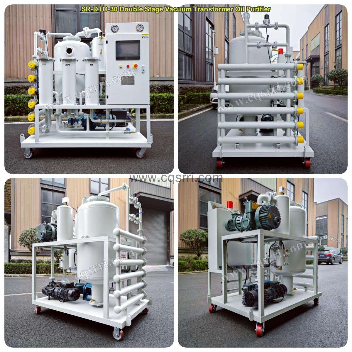 This is a high vacuum transformer oil purification machine SR-DTO-30 (1200L/h, other flow rates are available too), equipped with PLC and larger touch screen. It's an ideal choice to eliminate the moisture, gases, other impurities etc. from transformer insulation oils to improve its BDV. It can be easily mounted on trolley too.